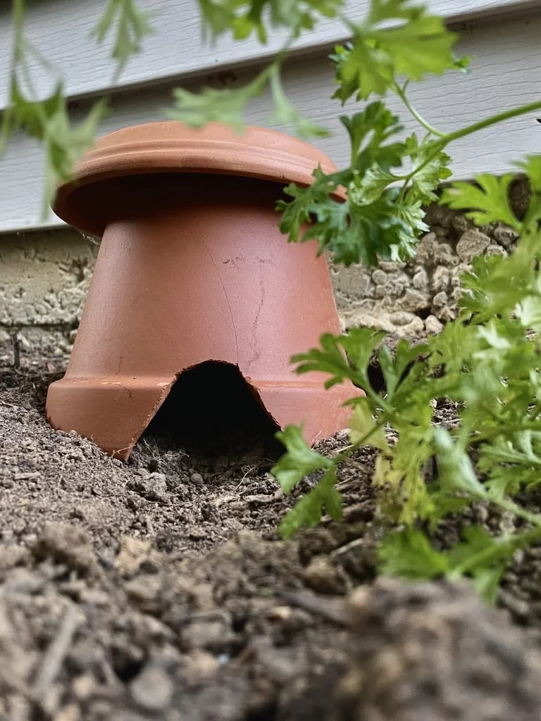 The number one thing I read was that our bug-eating friends need a safe place to retreat. I got this toad house a couple years ago so I moved it closer to the problem area of the garden. I then added an additional overturned broken pot. It was cracked but I went ahead and made the opening a little larger, then filed the edges of the jagged parts so no harm comes to the new residents. I don't know why but I find them so cute!