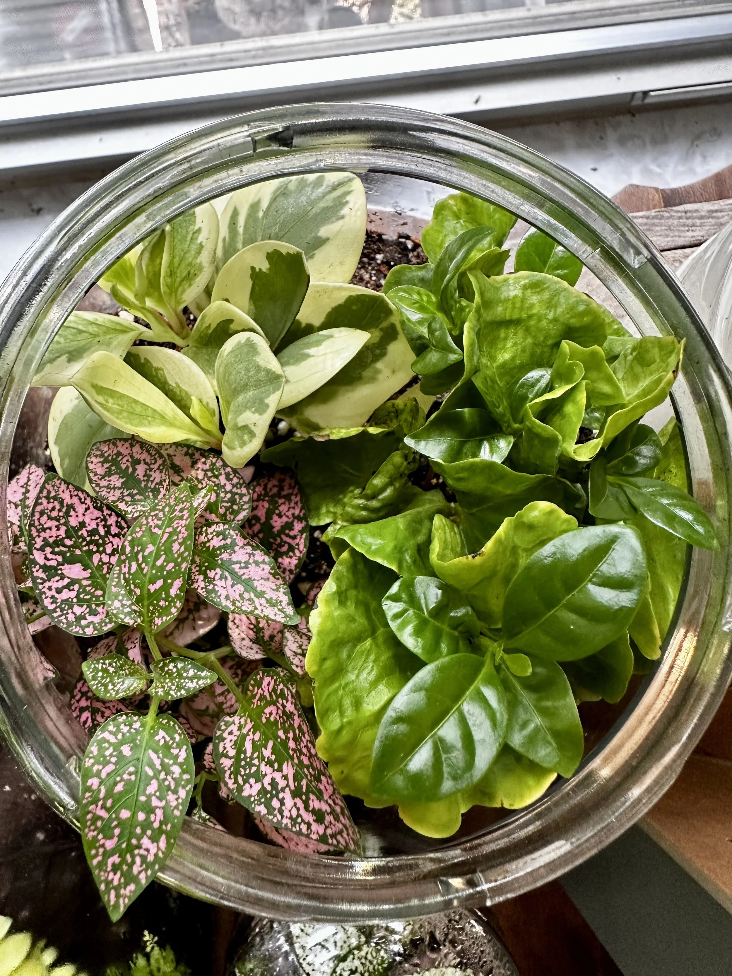 Terrariums are self-sustaining ecosystems in enclosed globes (or something similar). While you can have what’s called an “open terrarium,” which are what you imagine: a terrarium without a seal or lid, terrariums at their core are meant to be enclosed. For any terrariums I make, I use tropical plants because terrariums retain all their moisture and can be anywhere from 70-90% humidity. Tropical plants love the humidity!