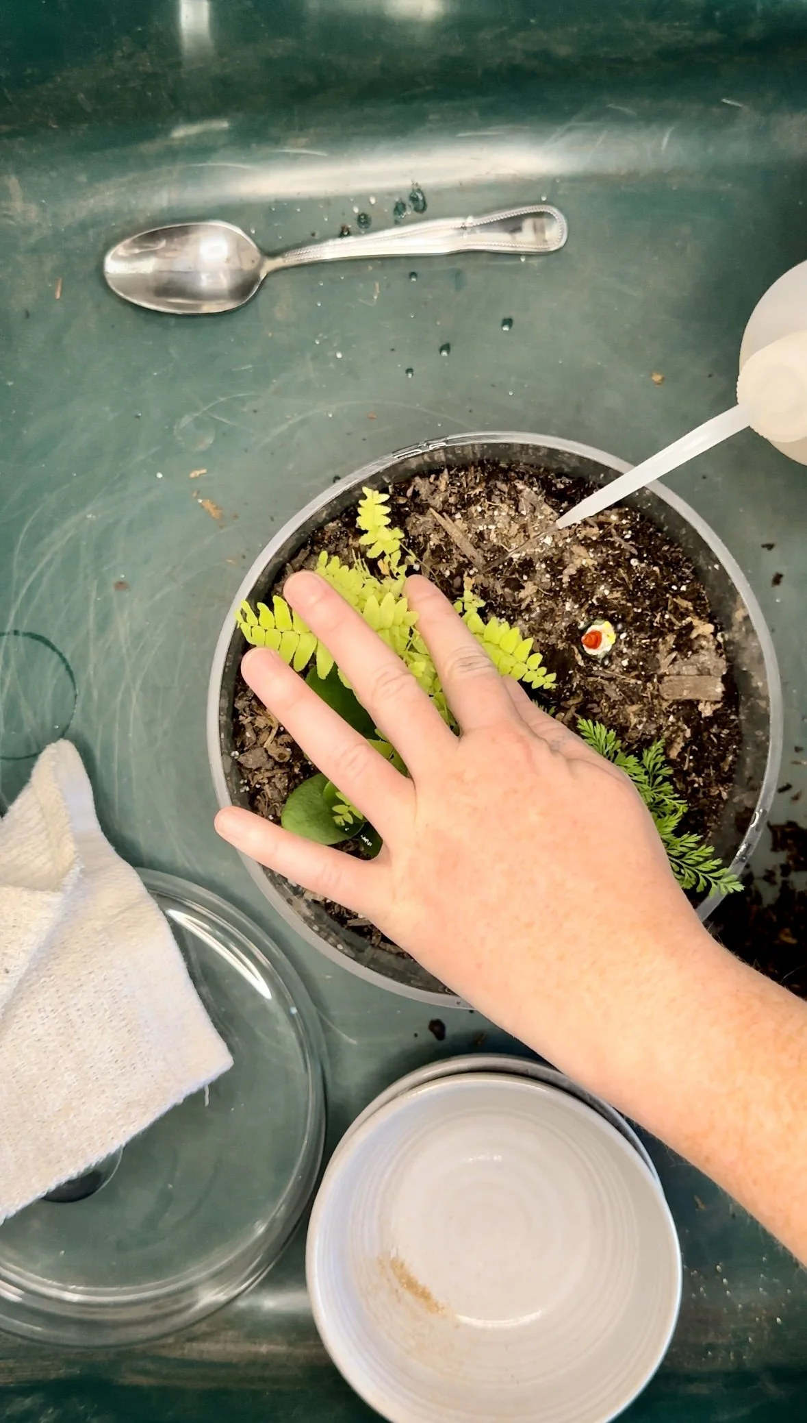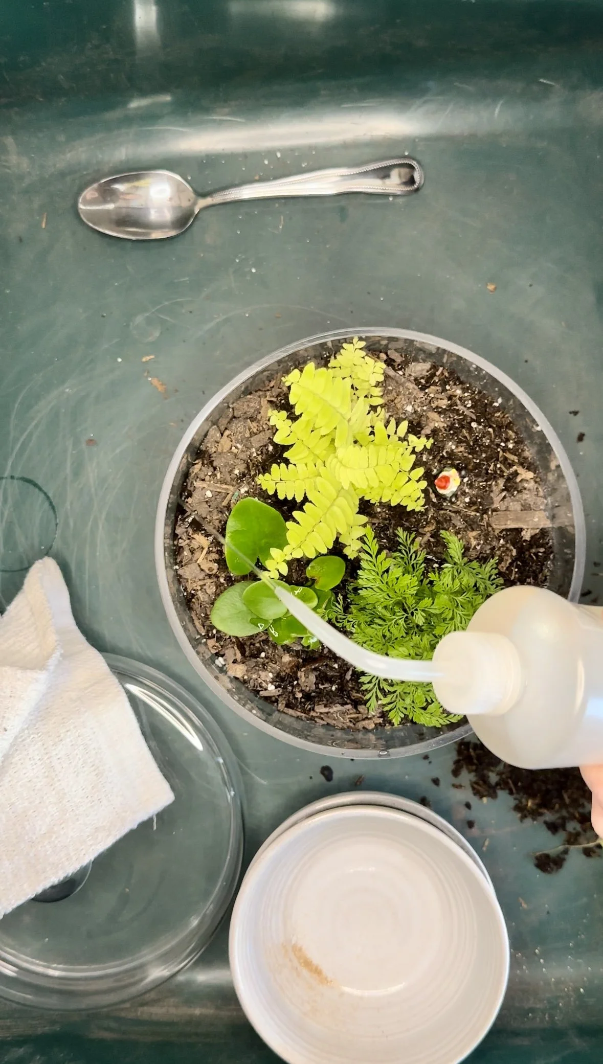Mist the inside of your terrarium, making sure to saturate the soil well. Once the soil reaches a uniform dark brown, stop. I use a squirt bottle because I can get the base of each plant and then along the side.