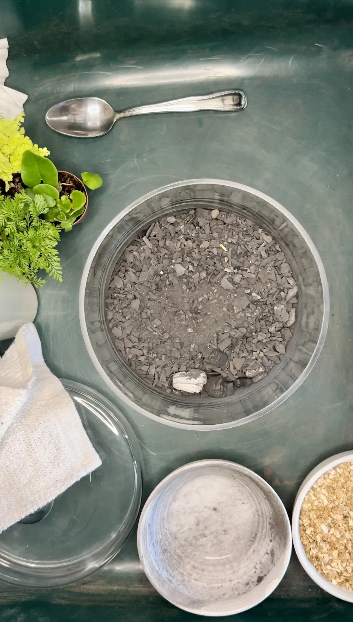 The first layer to go into your container will be the charcoal. I try for about an inch of charcoal in large terrariums, and about half an inch in smaller ones. There’s no right or wrong answer here, so don’t worry about breaking out that ruler.