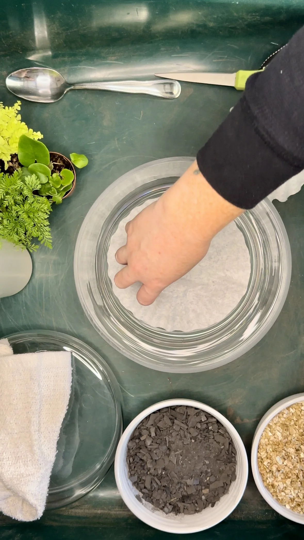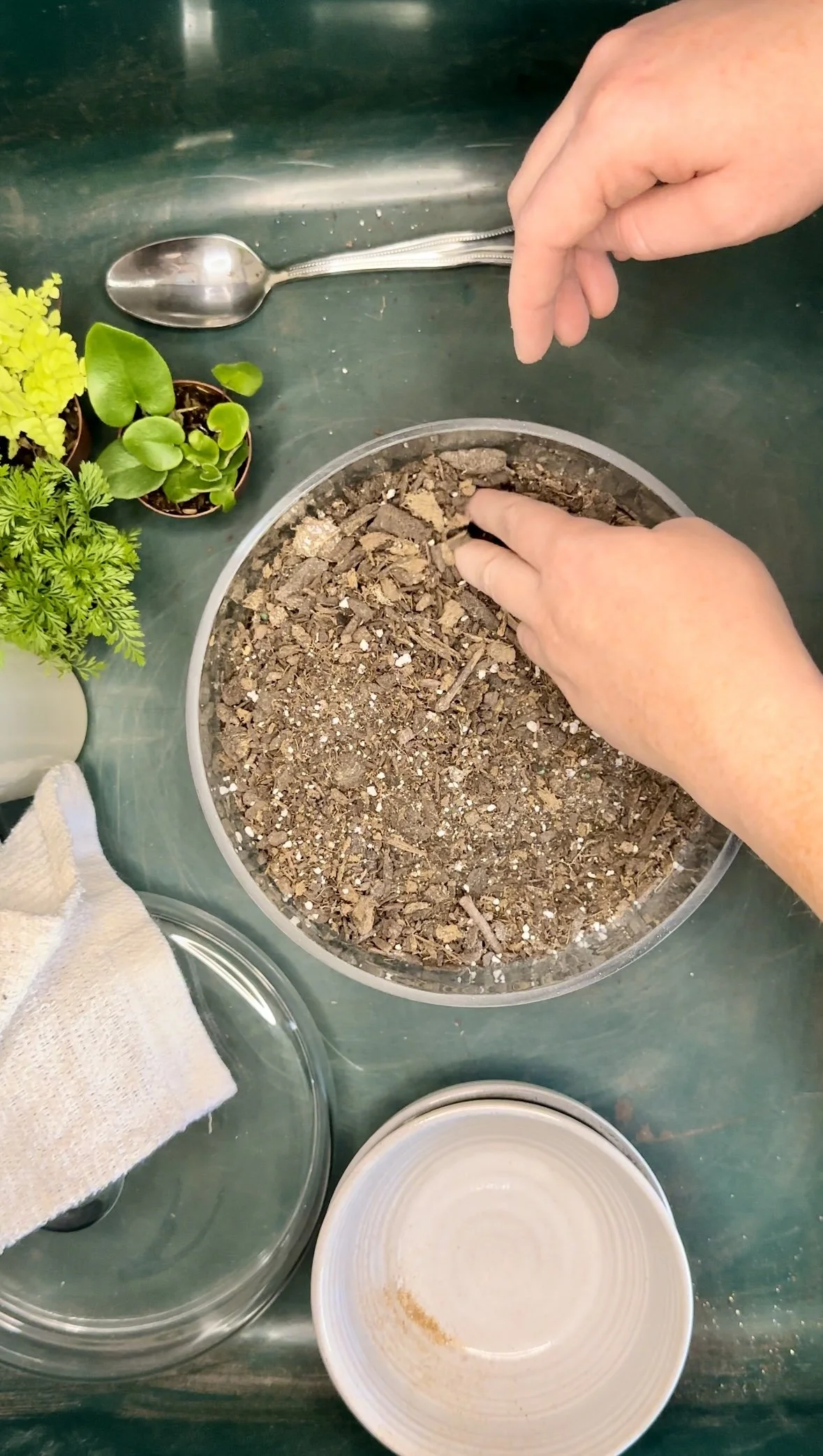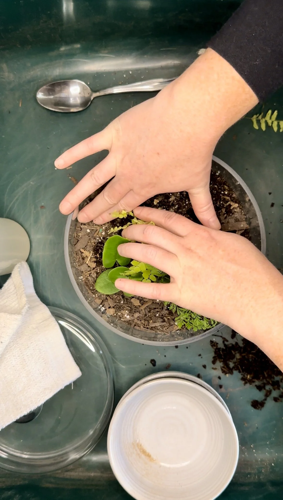 If you’re harvesting your own moss from nature, be aware that a small piece can grow to cover the whole terrarium. It’s slow growing but it’s so worth it to watch it grow to fill the space. Place a piece of harvested moss on the top of your soil and wiggle it gently into the soil surface.
