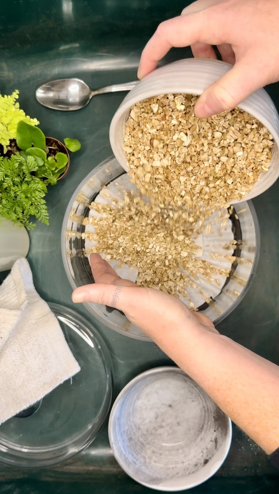 If you’re using a “moss milkshake,” or ground moss, a little goes a long way. Sprinkle a light layer across the top of the soil and rake it into the soil with a fork. Then mist it down and let it be!